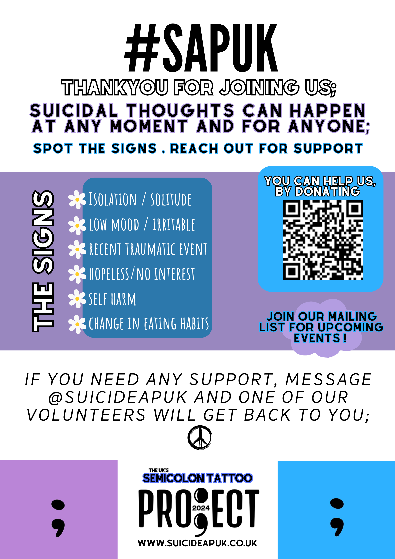 If you need custom materials for your organisation, school, or community event, please contact us. We can provide tailored resources to help spread awareness about suicide prevention.
